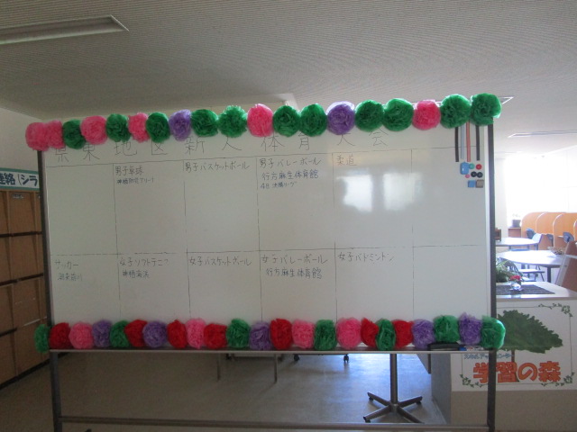 学習の森(職員室前)に新人戦速報用ホワイトボードが置かれました、2年生の女子生徒さんが応援の気持ちを込めて花飾りを作成、飾りつけしてくれました。ありがとうございました。
