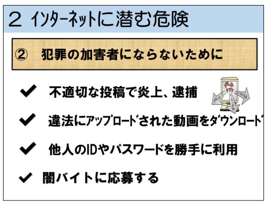 本日の6時間めに2年生の生徒を対象にしたメディア講習会が開かれました。鹿島警察署のスクールサポーターの方を講師としてお招きしました。主にインターネットに潜む危険性について学びました。講師の先生からは、「1、SNSで知り合った人と直接会わない。 2、住所や名前など個人情報を載せない。 3、自分や友達の写真を送らない。」などの助言をいただきました。安全で安心な生活を守るためにも、今日学んだことを生かしていきたいですね。