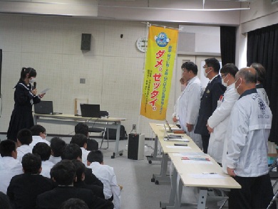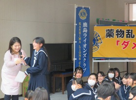 本日の3,4時間めに鹿島ライオンズクラブの皆様が鹿島警察署の協力を得て来校され、一年生を対象に薬物乱用防止を開いてくださいました。目的は「(生徒の皆さんが)教材を通じて薬物についての正しい知識を得るとともに、薬物乱用を未然に防ぐ強い心を養うこと」です。ロールプレイでは、生徒代表の皆さんと先生方とで薬物を誘われた時に勇気を出して断ることなどを行いました。また、本校保健委員会の生徒の皆さんと養護教諭とで動画を作り、皆で視聴もしました。保健委員会の生徒の皆さん、養護教諭の先生、また、出演してくださった先生方、ありがとうございました。お医者様や薬剤師様、鹿島警察署長様など、鹿島ライオンズクラブの皆様のおかげで、薬物乱用防止について多くのことを学ぶことができました。また、エフエムかしま様も取材に来られました。ありがとうございました。