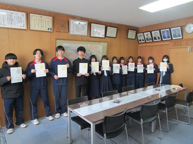 本日の昼休み、「第3回新春鉢形かるた大会」のボランティアを行った13名の生徒の皆さんに「ボランティア活動証明書」を手渡しました。第3回新春鉢形かるた大会実行委員会から「地域の一員として積極的かつ献身的に努力を惜しまず活動してくださいました。」とありました。3年生は、中学生でのボランティア参加は最後かもしれませんが、引き続き地域のために活躍してほしいです。