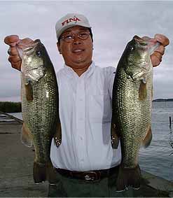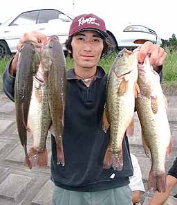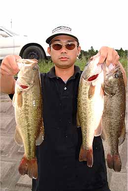 | 今回も特筆すべき事は 何も考えていませんでしたが とりあえず入ろうと思う場所は 3カ所に決めてありました。1つは横利根川と前川(理由はときどき友人と行っては、 たいてい釣れるためアプレがない) 2つめはマリーナ(先週のJBCCの大会の放流バスがたまっている) 3つめは宇崎エリア(JBCCの大会で私はこの沖で釣っていたのですがオカッパリが 結構釣れていたから)です。ただ当日までいっどこから入るか かなり悩みました。 と言うのもどれもこれといったキメテがないのです。 1つめのエリアは型が小さく入賞の可能性がやたら低い またギルの総攻撃がありそう 2つめのエリアは他の選手と取りあいになるかも?またまだ回復していないかもしれない。 そして3つめのエリアはみんな持っていってしまってもうすでに残っていない。 どうしようか‥・。でも当日になってその迷いはすぐなくなりました。それは風でした。 とにかくこの風ではやりやすいところからやってみるか。と言うわけで 最初に横利根川に入り2投めで案の定、極小バスがつれました。 でもとりあえずアプレはないと結構ニコニコでした。それからまもなく この日一番の大物が掛かりましたがあえなくラインブレイク 非常に残念です。 次に前川へいきましたがここではやっぱりギルの猛攻にあって 逃げるようにマリーナヘ移動 しかし全く釣れないダメか‥・。この後宇崎へ移動するのですが 私の後にA氏がすぐに入って釣ったそうで スンゲー悔しいです。 宇崎では割とイージーな展開で 一本目はクイ脇ででもバラシ 二本目もやはりクイ脇ででもバラシ この時点でチョークサッて「オワッタナ!」 やっぱりいつものオレなんだナ。でした.‥。ところがここから 今日の本番でした。 テクトロで三本目がナント!キロフィッシュ四本目が約600 この時点で三本揃ってもう ニコニコでした。でも何かが違ういつものオレじゃない。そうだ今日はスピナーベイトを投げていない。しかもチョット欲も出てきてこの極小バスをなんとか 入れ替えられないものか‥.。 そして遂にバスをヒット やっぱり釣りはこうでなくっちゃ!震える手(正確にはネット) でバスをゲット。ヤリィー!私にとってこのバスはキロフィッシュよりウレシイ バスでした。 思わずガッツポーズしてしまいました。正直なところ5位くらいで入賞できればイイナと思っていたので 3位と聞いて最高にウレシイです。本当にアリガトウございました。 使用タックル ダウンショットリグ プロ4 FLS−60B ダイワトーナメントX2500IT デュエルフロロブラス4ポンド FINA SPS131 FINAリアルグラブ1.5インチ TD ソルティースラッガー(廃盤)ゲリヤマカットテール4インチ スピナーベイトTD LT661−3RB−S TDトーナメントS 105PIサンライン FC−スナイバー 8ポンド FINA BABE SPIN1/2 |