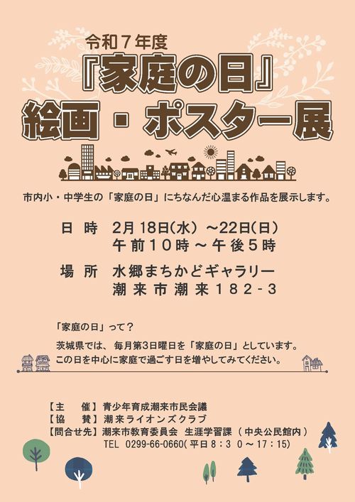 青少年のための機会を提供して子どもたちがより安全で健康的に成長することを願い、2/11~2/16まで市内小中学校の「家庭の日」絵画・ポスター展を水郷まちかどギャラーで開催。家庭は、ふれあいと安らぎの場であるとともに、青少年の人格が形成される基盤です。また、人との関係のあり方や社会のルールを学ぶ場でもあります。これらのことを家庭や地域が再認識し、「心豊かで明るい家庭」づくりを進めることが望まれています。「家庭の日」をきっかけにして、家庭の大切さや家族のあり方について見つめ直すことを目的に「家庭の日」絵画ポスター展を開催しました。
