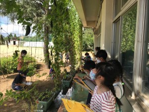 朝の早い時間帯にツルレイシの観察を行いました。7月の日照時間が少ないことが影響し,生長に遅れが感じられましたが,ここにきて多くの実がなり,子どもたちも観察をしながら育ったツルレイシを見て喜んでいました。