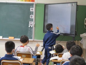 早速,クロムブックを使って学習しています。国語では,自分の好きな色や遊びなどのアンケートに答えると,一瞬でクラスの結果が電子黒板に写し出され,子供たちから歓声が上がっていました。