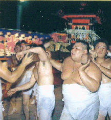 毎年7月29〜30日に行われる山田祇園祭り。29日夜,御仮屋から芸津宇田河岸まで御輿をかつぎ,そこから御浜下りし,北浦湖中でもみまくります。