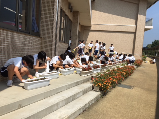 先日苗を植えたプランターに応援メッセージを貼りました。