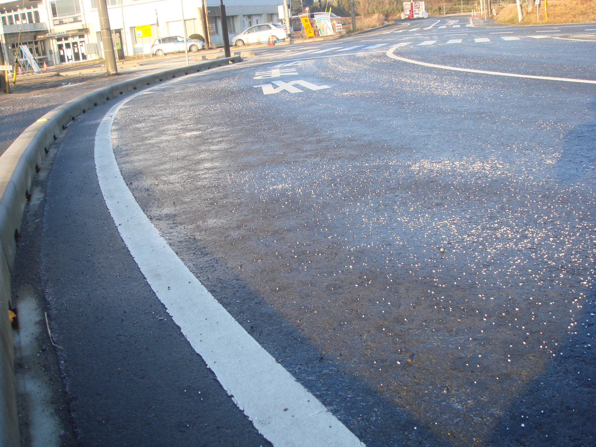 正門前の道路に融雪剤がまかれていた。市や地域の方々が生徒の安全な登校や自動車などの安全な走行のために活動してくださいました。感謝しております。