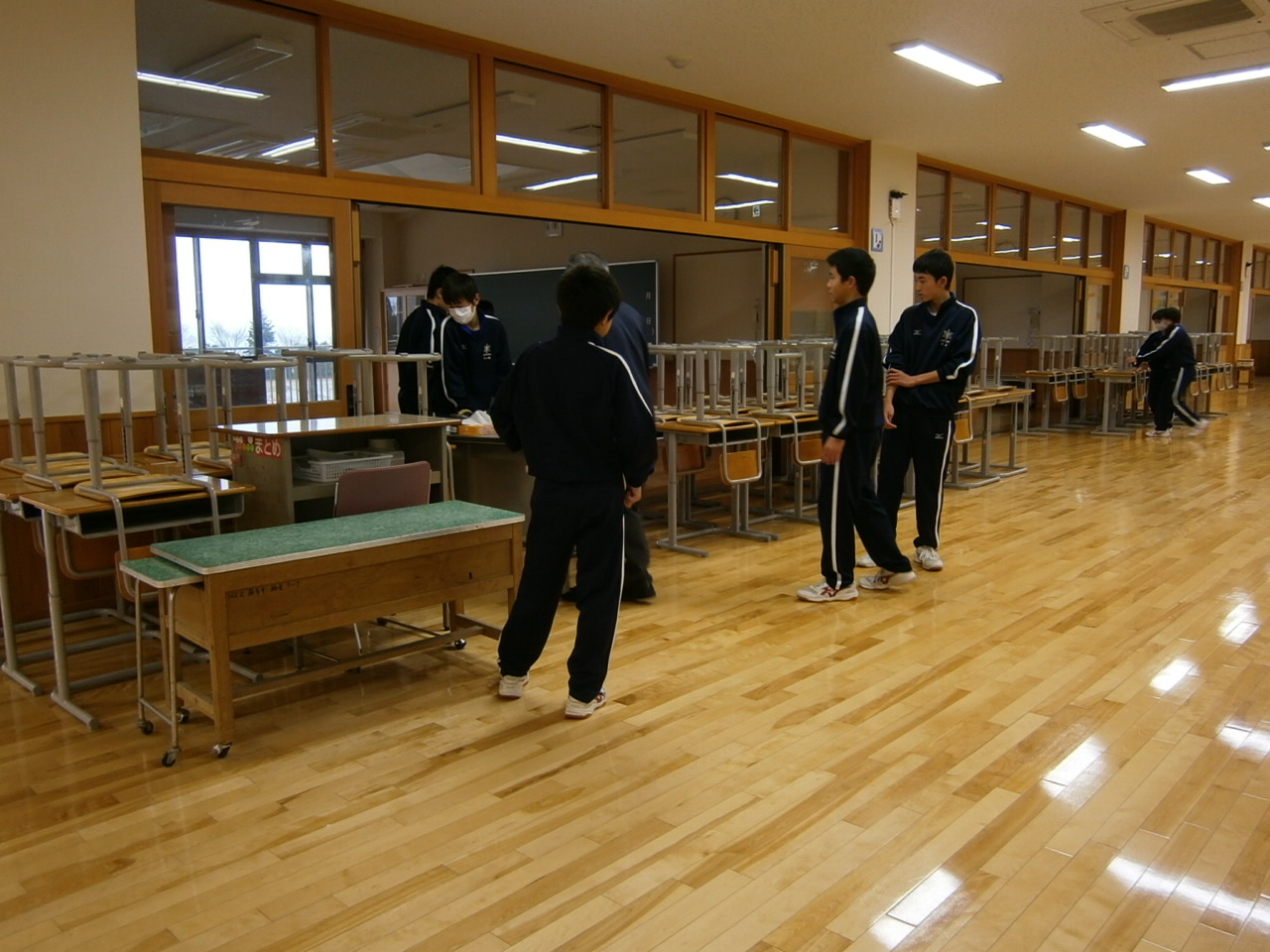 卒業した3年生の教室のワックスがけの準備を行いました。
