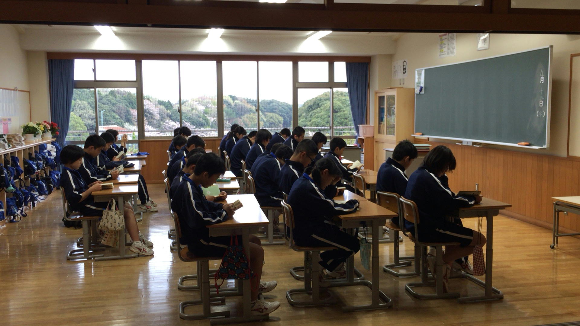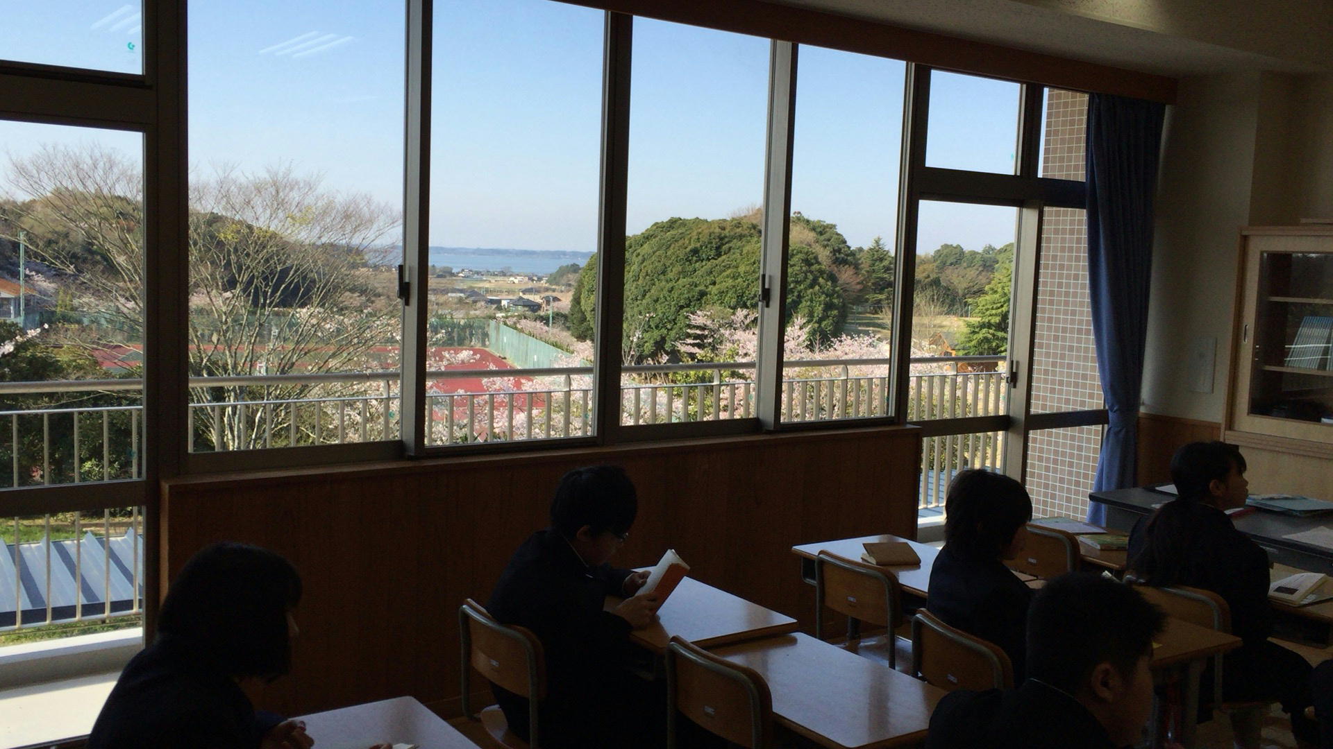 朝の部活動を終え,教室に戻る。友達とおしゃべりをしながら着替え,時間になると静かに朝の読書が始まる。こうして麻生中の一日が始まります。先生が教室にいないときでも,時間になると行動できる生徒が麻生中の生徒です。教室の窓から見える霞ヶ浦と桜もとてもきれいです。