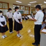 本校では,コロナウイルス感染症予防のために,さまざまな対策を講じています。先日は生徒会役員任命の様子をリモートで配信しましたが,各学年の学級役員任命や各種検定などの表彰については,各学年ごとに実施しています。今朝は3年生の表彰・任命が行われました。任命された学級役員を代表して,各クラスの委員長がみんなの前で意気込みを発表しました。