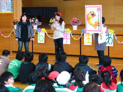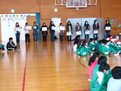 | 昨日は,中学生とのお別れの会でしたが,今日は1〜4年生にとっ ては,国際理解教育[英語]でお世話になっているメンディー先生との お別れの活動になってしまいました。 ※ 5・6年生は,来週が最後の外国語活動です。 今日の卒業式の練習は,昨日に引き続いて6年生を入れて行いま した。昨日に比べると,6年生も在校生も昨日より声がそろっていて, 声もしっかりしたものになっていました。来週の月曜日に北浦中学校 の卒業式が行われます。その後は,体育館を使っての練習が行われ ると思うので,限られた時間になりますが,がんばっていきましょう。 |