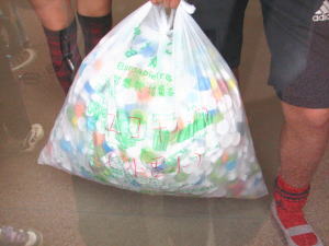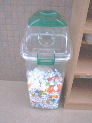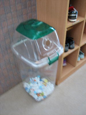 6月8日(水), 設置9日後の朝の 回収箱のようすです。 ほぼ,回収箱一杯に なったので 児童会のメンバーが 第1回分として袋に まとめました。 |