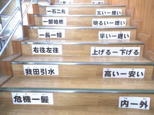 | 2学期[11月21日(月)]に突如昇降口の階段に出現したものに,日常で使っている『対 義語』やよく使っているけど,その意味となると曖昧なのものも少なくない『四字熟語』があ ります。 これは,旧小貫小学校の校舎の階段に使われていたものをそのまま移設したものです。 日常使う階段を学習環境に利用したものですが,四字熟語はその意味も階段を登りきっ たところに全部掲示してあります。言葉によっては,一緒に生活している中学生にも役立つ ものもあるのではないでしょうか。 余談ですが,1年生の教室の出入り口の引き戸には,学習した文字[ひらがな・カタカナ・ 漢字など]の意識付けを行うアイディアが施されています。 見るものすべてが新鮮に映るであろう小学生にとっては,環境はとても大切です。 |