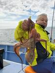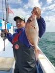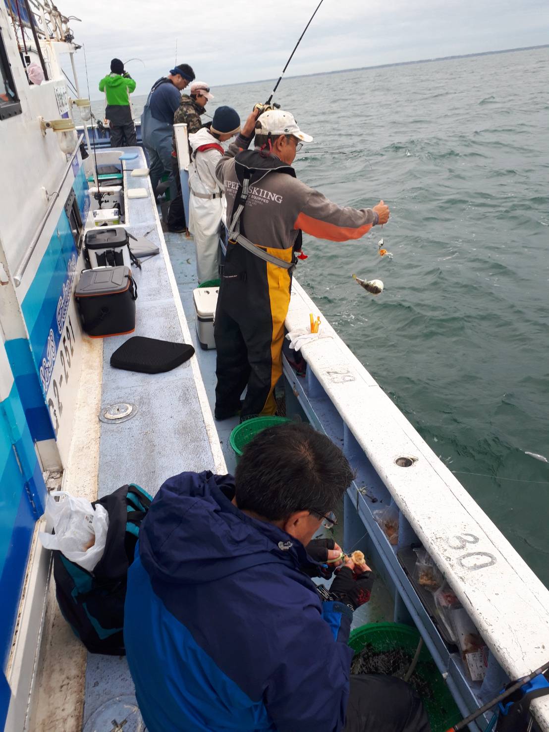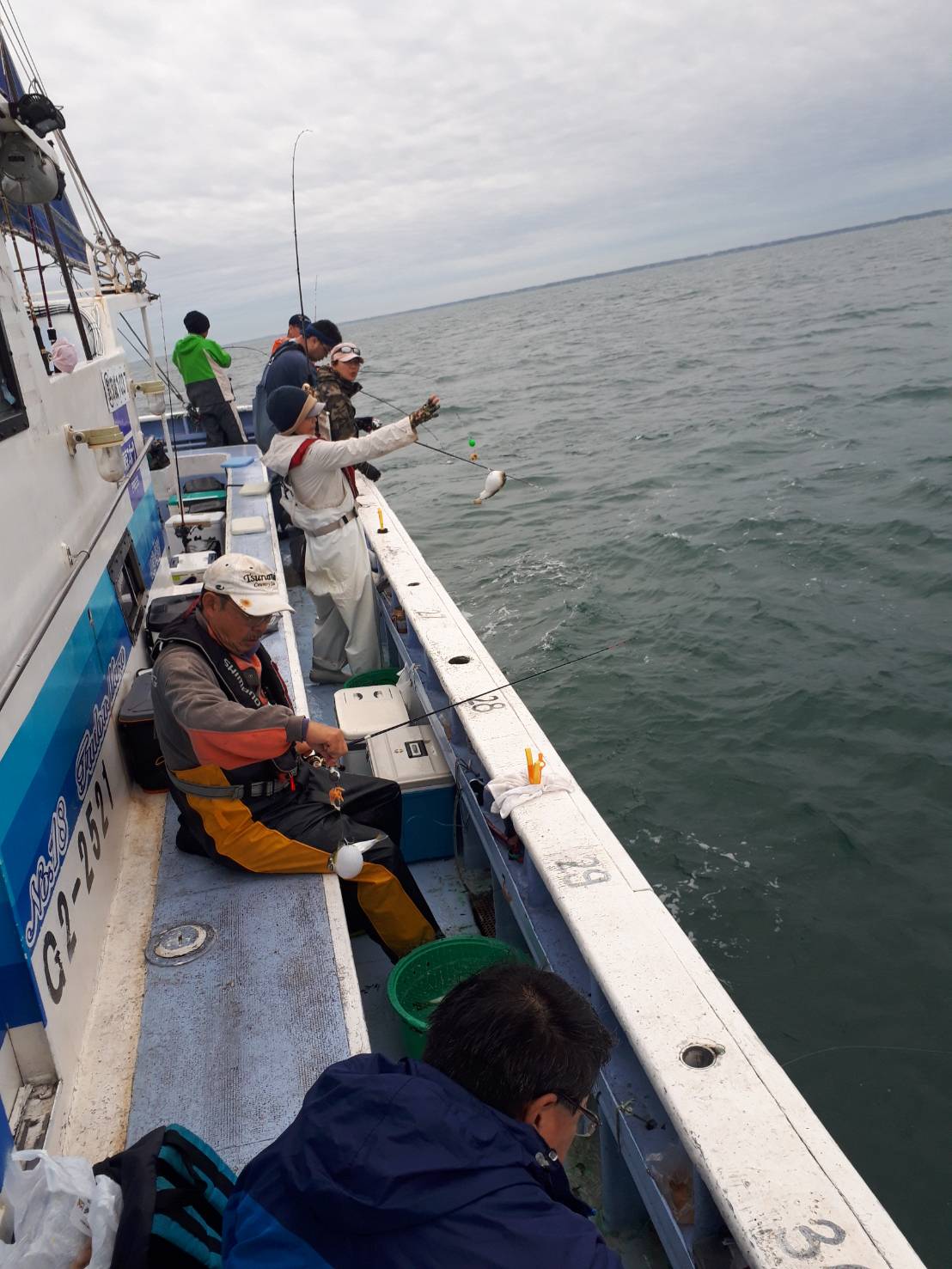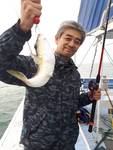 ・本日も近場の28メートルから始めました。 朝のうちは好調でポツリポツリ🐡は掛かってくれました。 お客様も多かったのでエサばかり盗られて苦戦する人もいましたが、前半でほとんどのお客さんはお土産は確保出来ました🎵。 中盤以降に北東風が強まって来ると、🐡が口を使わなくなってしまい型を見るのがやっとになって来ました。 🌊も出てきて船酔いダウンする人も出始めてしまいました😰。 それでも最後まで数匹ずつは型が出ました。 まだ潮濁りも強いので海が落ち着けば、また好転する事と思います❗。 明日は定休日、休み明けまた頑張って🐡探します😊❗。 |