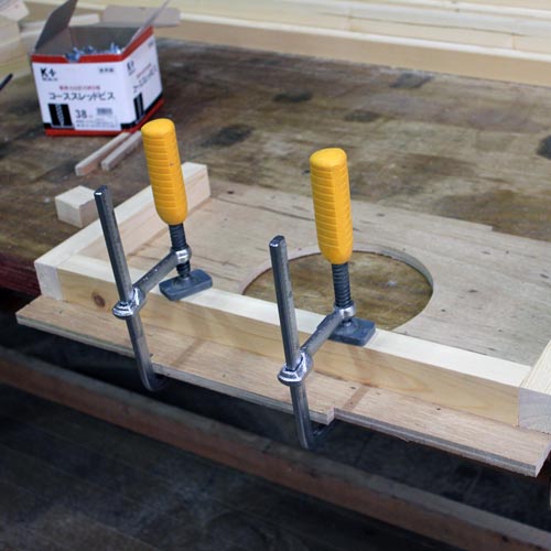 材料の下に垂木などで下駄を履かせて,クランプで固定すると作業がしやすく安全です。