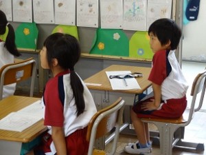 1年生 よい姿勢です算数の時間。とってもよい姿勢です。みんな集中して話を聞いています。 「いくつになるでしょう。」たし算です。 「できた!」「できたよ!」声が聞こえます。