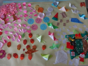 「6年生を送る会」の準備。 5年生を中心に,全学年で進めています。 2年生が植木鉢を飾り付け,4年生がお祝いの花にメッセージを書き込みました。