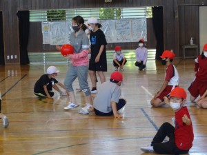 本日の縦割り班遊びは1班から5班です。 教育実習生も一緒に活動しています。