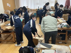 1年生の技術の時間に、地域の方々にのこぎりの使い方でご指導いただきました。コミュニティースクールのコーディネーターの菅谷さんに「のこぎりの指導でご協力いただける方」をご紹介いただきました。生徒一人一人困り感に丁寧に関わってくだいました。実際に手本を見せてくださったり、手を添えて力のいれ具合や切れ味を体感させてくださったりしたので、生徒たちは短い時間の中でもコツをつかんでいました。
