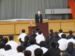 みんな頑張っています。 令和4年度最終日、修了式を無事に迎えることができました。コロナ禍3年目も様々な制限のある生活の中でしたが、生徒たちの活躍と成長する姿をたくさん見ることができました。これもひとえに、保護者の皆様や地域の方々のご理解とご支援の賜物と感じております。ありがとうございました。最終日の今日は、部活動の表彰(報告)のあと、修了式が行われました。修了式の中で、代表生徒の振り返りの作文発表、鷲内台の表彰、修了証授与、学校長式辞が行われました。話を聞く姿勢も立派でした。その後、学級活動で一人一人通知表が手渡されました。各学年順番に、机・椅子の移動があり、次年度に備えました。協力しながら手際よく進める姿が頼もしかったです。