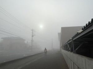 今朝は、霧が濃く視界が狭く、自転車で登校のは、大変だった様子でした。ヘルメットや髪の毛が濡れている生徒もいました。朝靄の中、今日も自転車で元気に登校する生徒が多く頼もしいです。