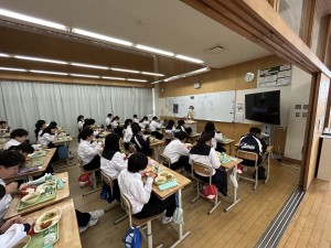 給食センターの職員の方々の訪問がありました。配膳の様子や給食を食べている様子を見ていただいた後に、1学年で食に関する紙芝居でバランスのよい食事についてお話をいただきました。1年生の配膳の仕方が手際よく、無駄なおしゃべりもほとんどなく協力しながらやる様子がすばらしかったです。これも、自立貢献の姿っです。また、給食センターの方々へのあいさつもすばらしかったです。「あいさつがよくできますね」と栄養教諭の高野先生からほめられる場面もありました。