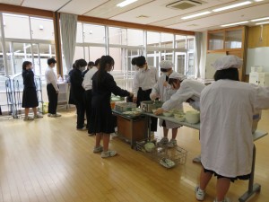 今日の給食のメニューはさんさいうどん、牛乳、さつまいもの天ぷら、ひじきのあえもの、お祝いクレープでした。 給食当番のみなさんも一生懸命に配膳をしています。給食センターのみなさん、いつもおいしい給食を作ってくださり、ありがとうございます。
